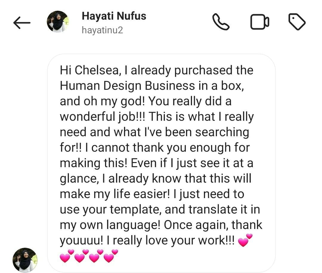 I have some of my clients question themselves and lack the confidence to read charts or create HD content, but “Human Design Business in a Box” comes with resources and cheat sheets so you can comfortably add HD to your business, without second-guessing every word you say.