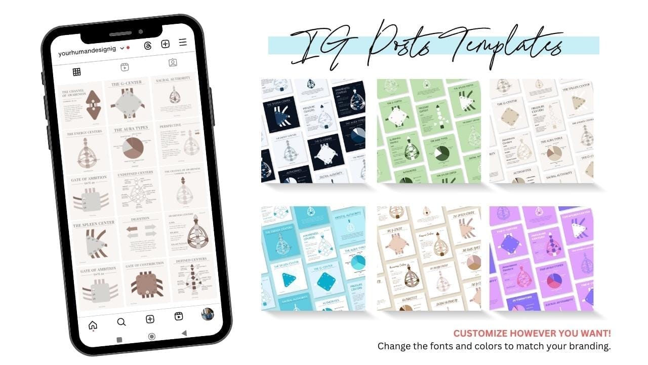 HUNDREDS of Human Design social media graphics featuring various Human Design elements (Types, Strategy, Authorities, Gates, Channels, and Variables) that you can easily customize using Canva to align them with your branding.