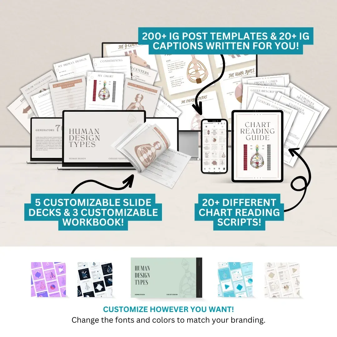 With "Human Design Business in a Box," everything is prepped for and ready for you to edit, from social media graphics to slide-show templates. And of course chart-reading scripts and cheat-sheets to make chart-reading a breeze!