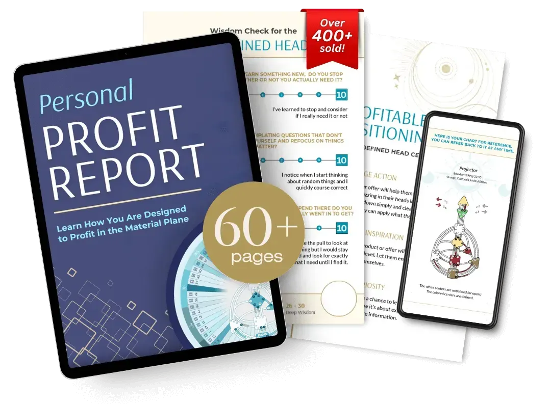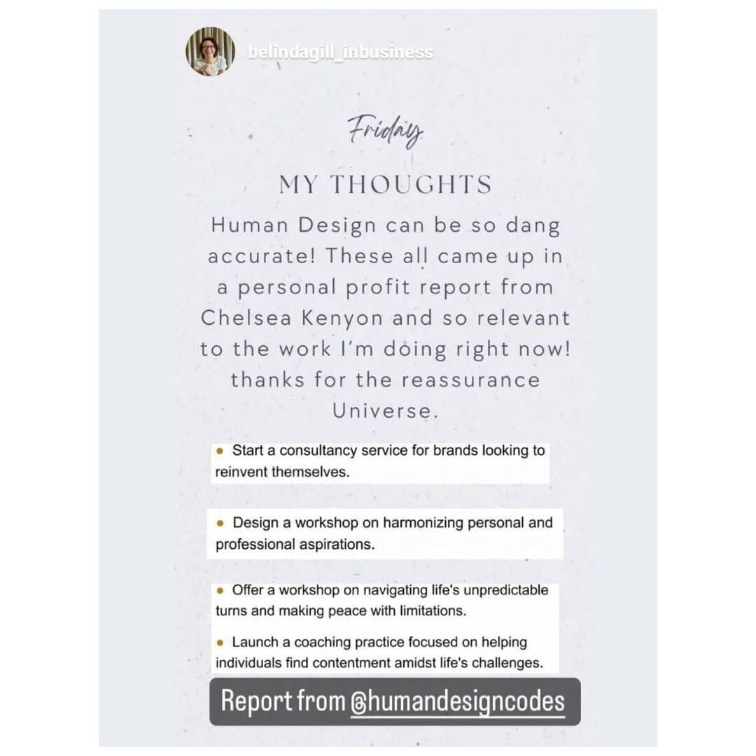 The personal profit report is fascinating and clearly explains the relevant parts of my personal Human Design chart that can show me what I am best placed to offer in my business, and how to do so in a way that aligns with my personal design. The report shows me the ways in which I am likely to find it easiest to operate in my business, based on my own make up of energy centres and defined gates so that I can act in accordance with what comes more readily to me as opposed to against it. I know I'll keep returning to this report as my business grows.
