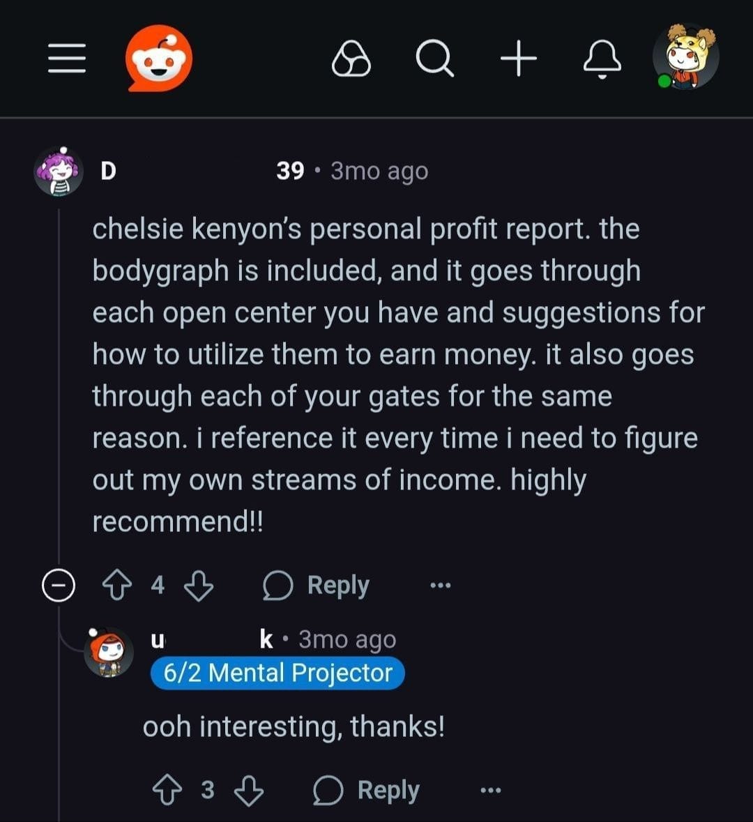 There are multiple assessments that help you gauge where you have gained the most wisdom so you can clearly see how you are meant to help others. It walks you through your profit centers, (this is different than the generic centers information,) as well as the material theme of certain gates within your chart that point to what you are here to contribute to the world (and make money doing so.) and along the way you'll find lots of contemplative questions, ideas, examples and suggestions to help.