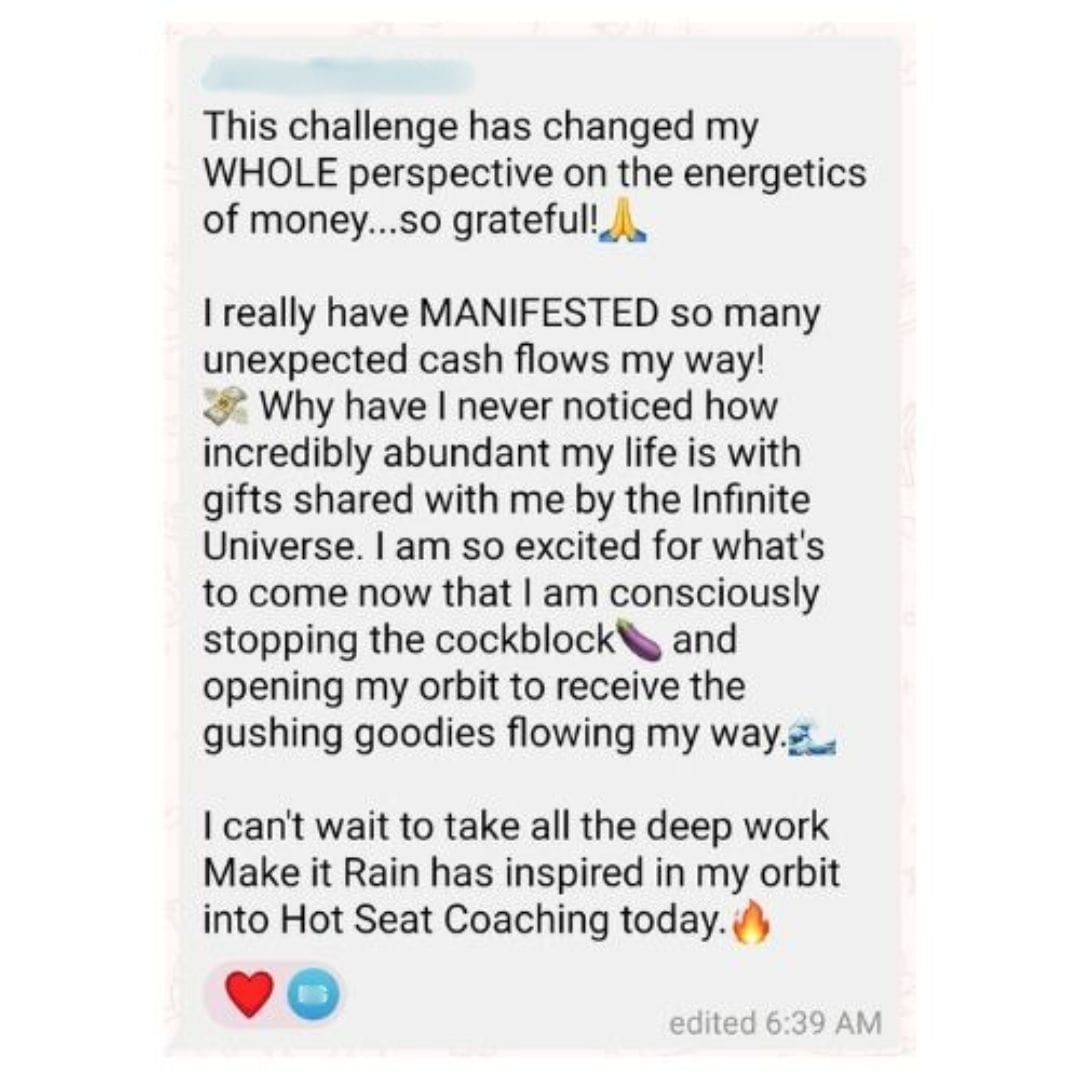 Thank you so much for the session yesterday, you helped me become aware of a sabotage I’d been blind to for the last 2 years! I can already feel the shift in my energy and business with the new offers you helped me create — they are so aligned and I can’t wait to launch these!